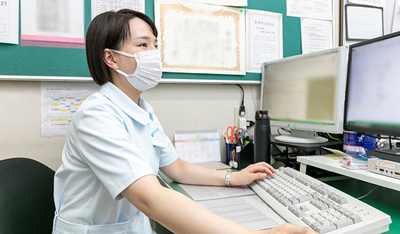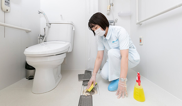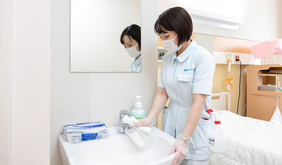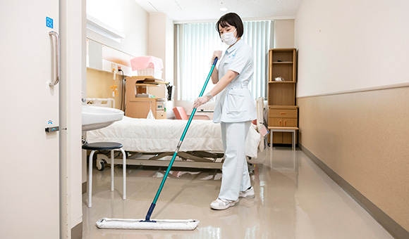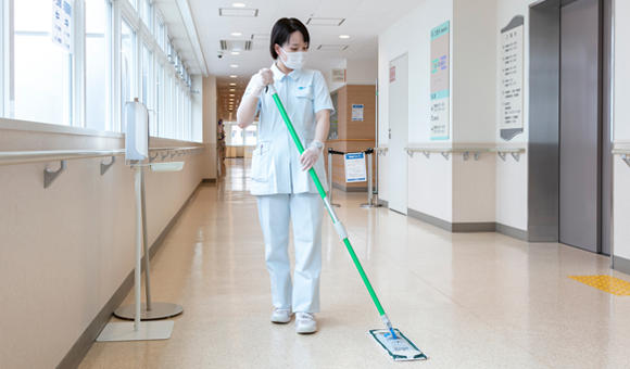 病院施設の清掃を担当しています。院内清掃の他に、事務全般・本社やオーナー様とのやり取り・スタッフへの業務分担などを行っています。